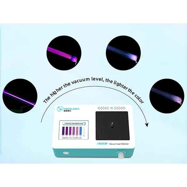 MatMeas CR2630 High Frequency Spark Vacuum Leak Detector utilizes the glow discharge principle to quickly assess the vacuum pressure inside sealed glass tubes by observing fluorescence color, referencing a vacuum spectrum standard for instant and convenient leak detection.
